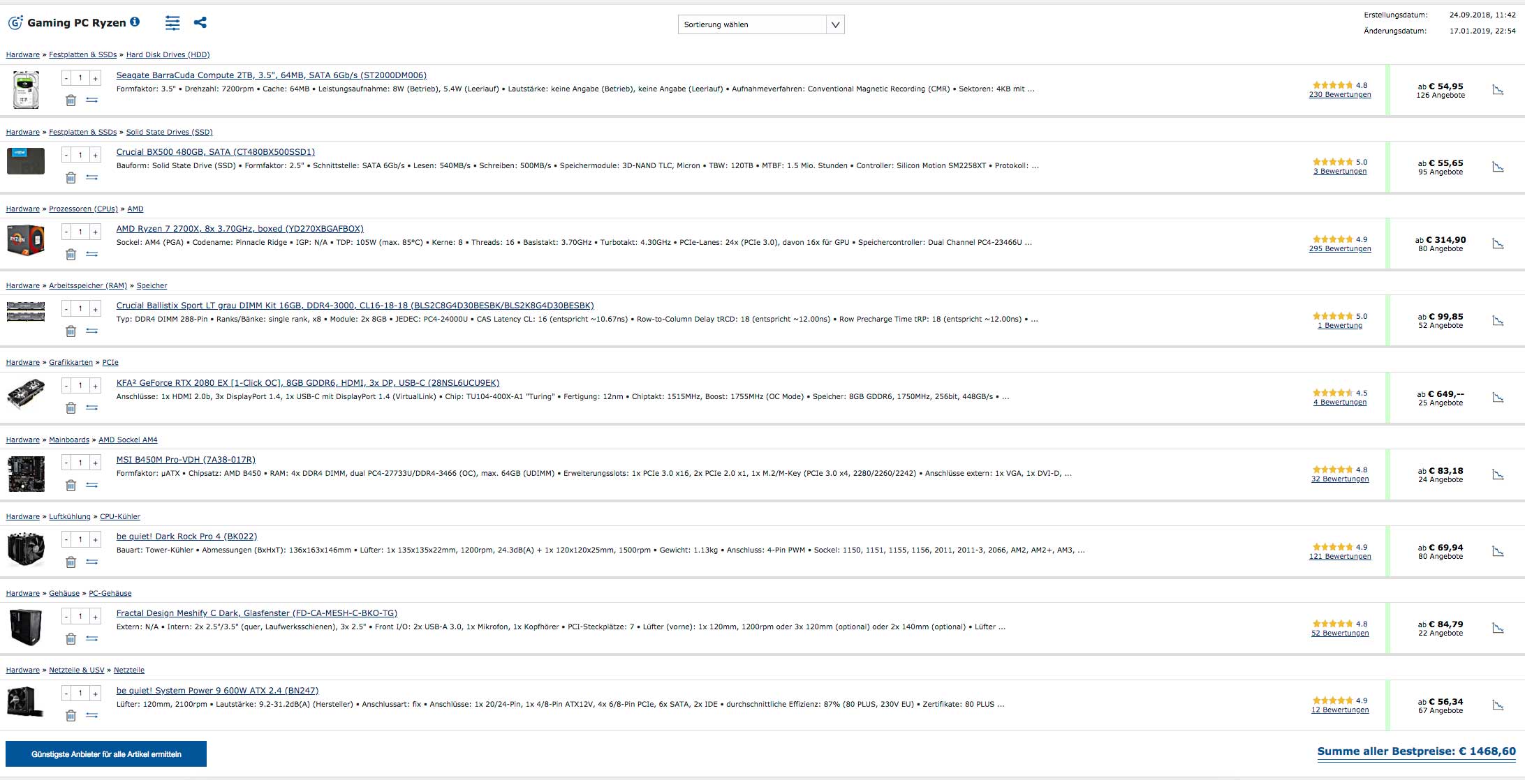Gehäuse: be quiet! Pure Base 600 Window Orange - Jop. Netzteil: be quiet! 600W System Power B9 80+ BULK -- Mag ich persönlich nicht, hier gibt es bereits die 11 Reihe und hat nur Bronze Zertifikat. Hier lieber: 600 Watt be quiet! PURE POWER 11 600W CM (Hat Gold Zertifikat sowie Kabelmanagment.) Prozessor AMD AM4: AMD Ryzen 7 2700x 4,35GHz AM4 20MB Cache Wraith Prism - Passt. Mainboards für AMD AM4 Prozessor: MB Gigabyte X470 AORUS Ultra Gaming (X470,AM4,ATX,DDR4,VGA) - Hier reicht (ASRock B450 Pro4 AMD B450 So.AM4 Dual Channel DDR4 ATX Retail) oder Gigabyte B450 Aorus Elite AMD B450 So.AM4 Dual Channel DDR4 ATX Retail - X-Chipsätze sind eher für übertacktung gedacht, welche man "etwas mit b450 auch hinbekommt", deswegen 40€ aufpreis nicht wert sind. Lieber 40€ mehr in eine Samsung Evo ssd zB. Arbeitsspeicher: DDR4 16GB PC 3000 CL16 CORSAIR KIT (2x8GB) Vengeance Black - Ist ok. CPU Kühler: be quiet! Shadow Rock Slim - Ist ok. Wärmeleitpaste: Wärmeleitpaste CoolerMaster MasterGel - Nutze ich, finde ich aber auch nicht wirklich toll. Lieber Arctic MX-4. Grafikkarten NVIDIA Geforce GTX: KFA2 RTX2070 OC 8GB Black USB-C-HDMI-3xDP DDR6