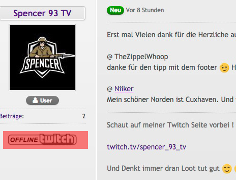 Ich bin der Spencer bin 25 Jahre jung und habe vor kurzer zeit das Streamen für mich enteckt , Ich Streame hauptsächlich PS4 Games wie Battlefield V , BO4 , Destiny 2 und bald auch Anthem.