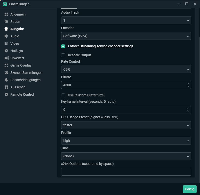 Vorher lief mein Stream auf 720p60 FPS und einer 4000er Bitrate, Keyframeintervall 0, Preset very Fast. (Ryzen 2600 6 Kerne/12 Threads - 16GB RAM - GTX 1060 6GB)