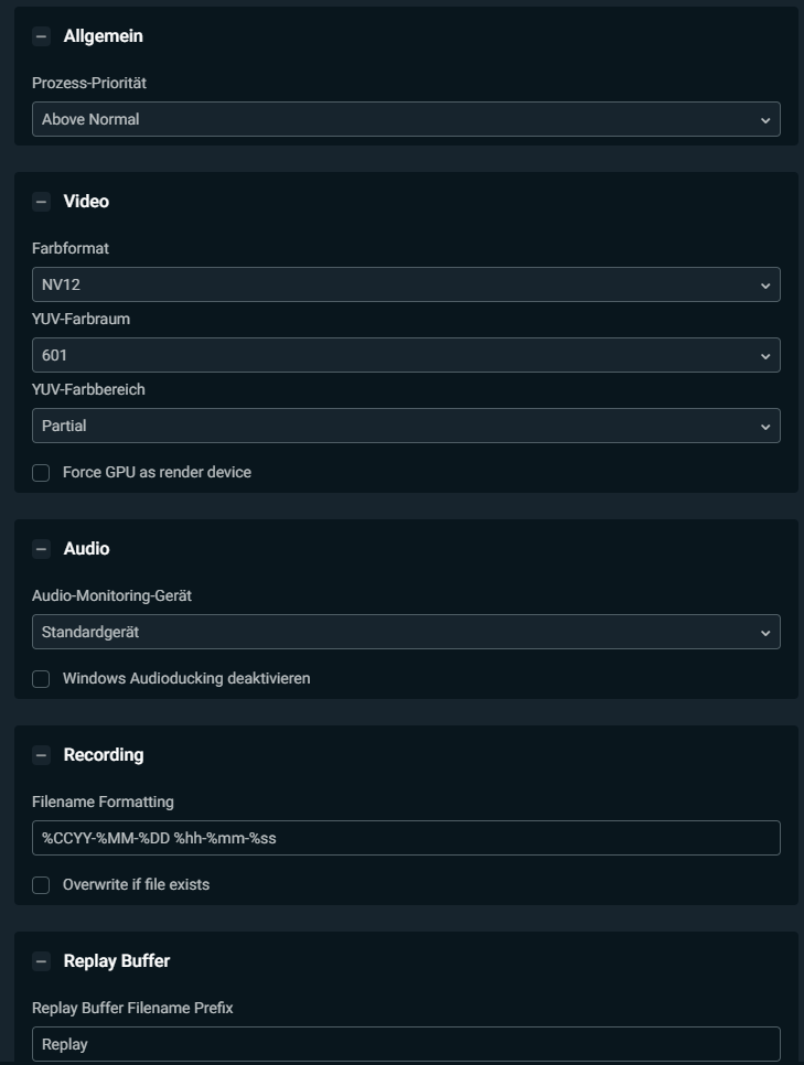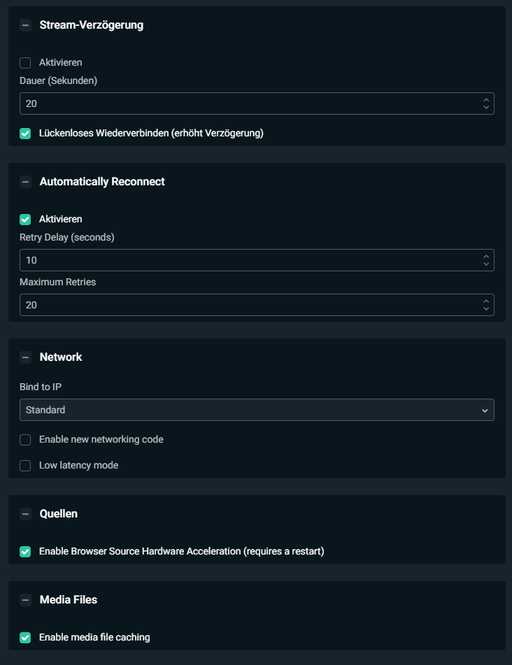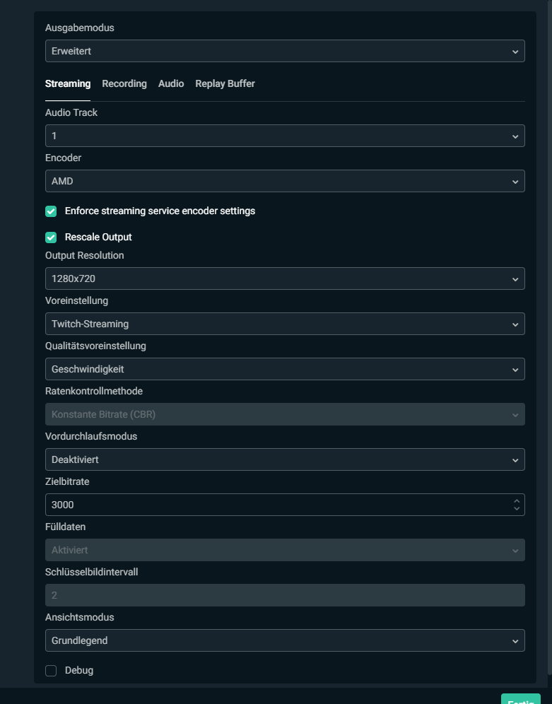 Meine ganzen OBS Einstellungen sind auf ein extremes Minimum eingestellt, so dass der Stream gerade noch genießbar für den Zuschauer ist. HEIßT: 720p30, 3000 Bitrate und alles recht weit runter gedreht.
