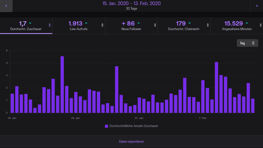 Es ist n bisschen verrückt, woher und warum. aber ich habe in letzter zeit eigentlich regelmäßig 5-7 Leute im Stream. Da komme ich dann auf einen Durchschnitt von 4 bei maximal 9 zuschauer.