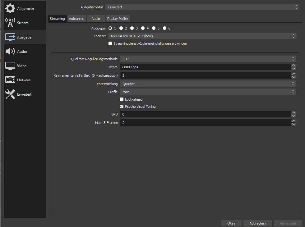 Habe ich im Spiel das FPS limit auf unbegrenzt, habe ich in OBS 30 FPS und es ruckelt und OBS sagt: "Encoder überlastet" auf 6000 bit. (NVENC new)