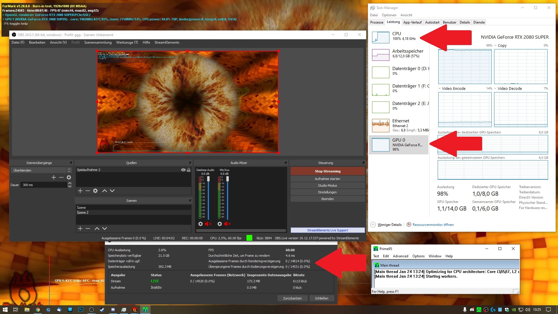 Prinzipiell sollte OBS + Gaming auch mit voll ausgelasteter CPU/ GPU ohne Frame-Drops funktionieren.