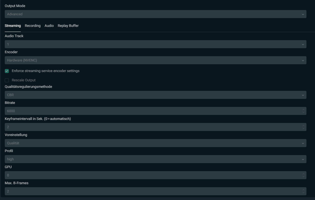 Ansonsten: Mach mal den Haken bei „enforce Streaming Service encoder Settings“ raus. Hat bei mir mal geholfen irgendwann
