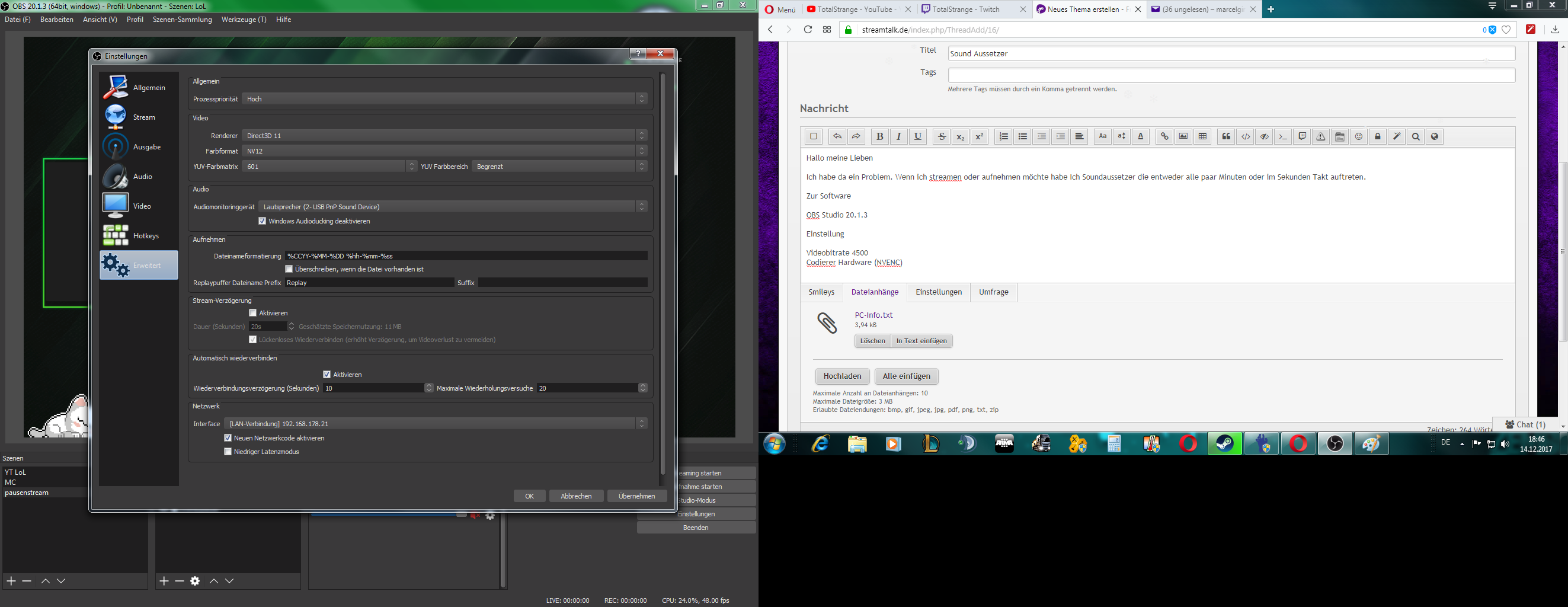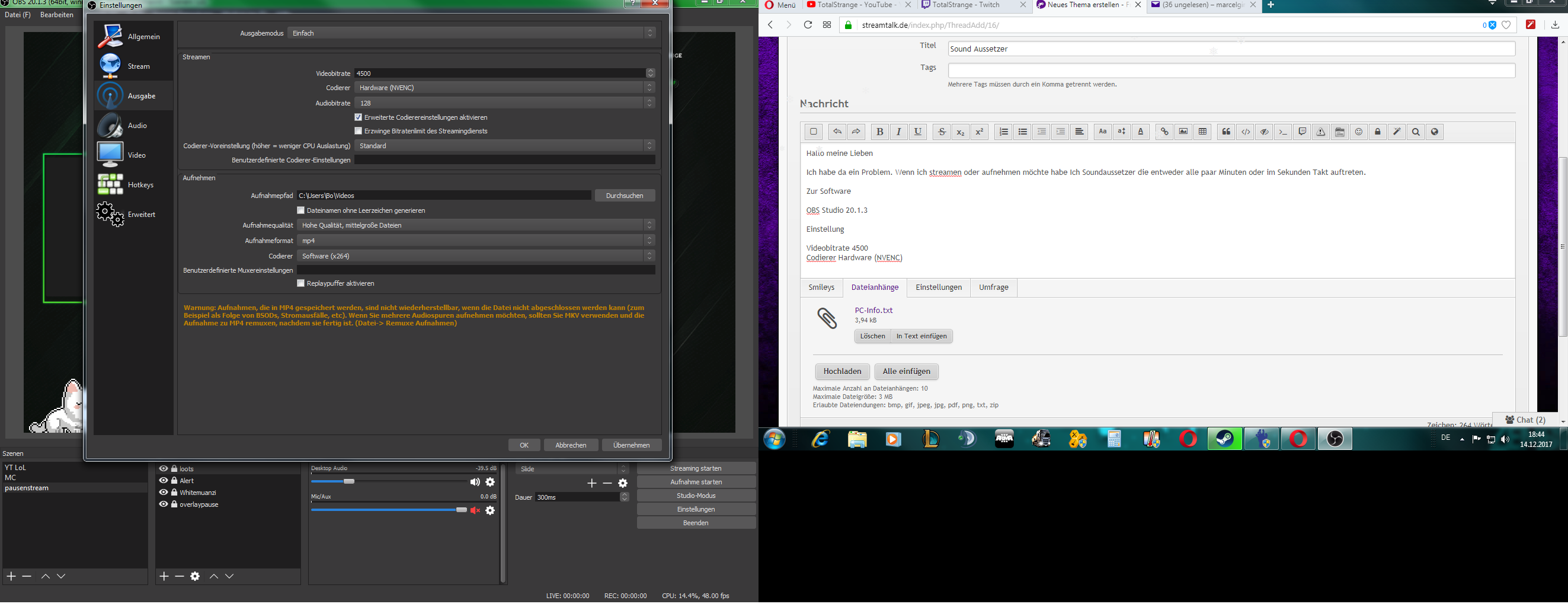 Habe im Anhang OBS Einstellung und PC Info da gelassen.