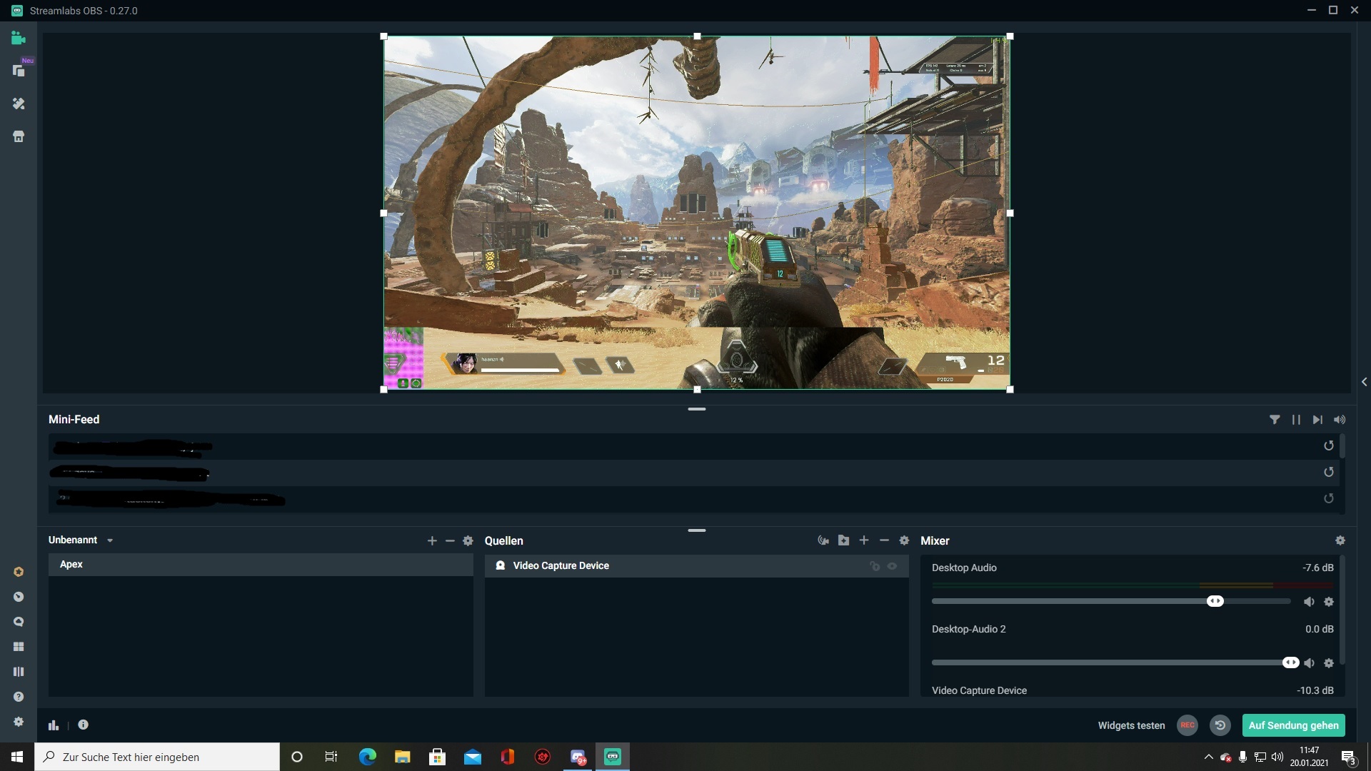 2. Problem: Hinzu kommt, dass beim Start eines Spiels oder beim Raustabben das Bild bei Streamlabs(und letztlich auch im Stream) stehenbleibt und ich jedes mal bei Streamlabs in den "Quellen" Video Capture Device deaktivieren und wieder aktivieren muss damit es weitergeht.