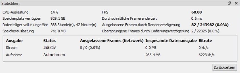 OBS sagt, ich habe 0,1% ausgelassene oder übersprungene Frames laut Log. Die Statistic sagt 0,0.