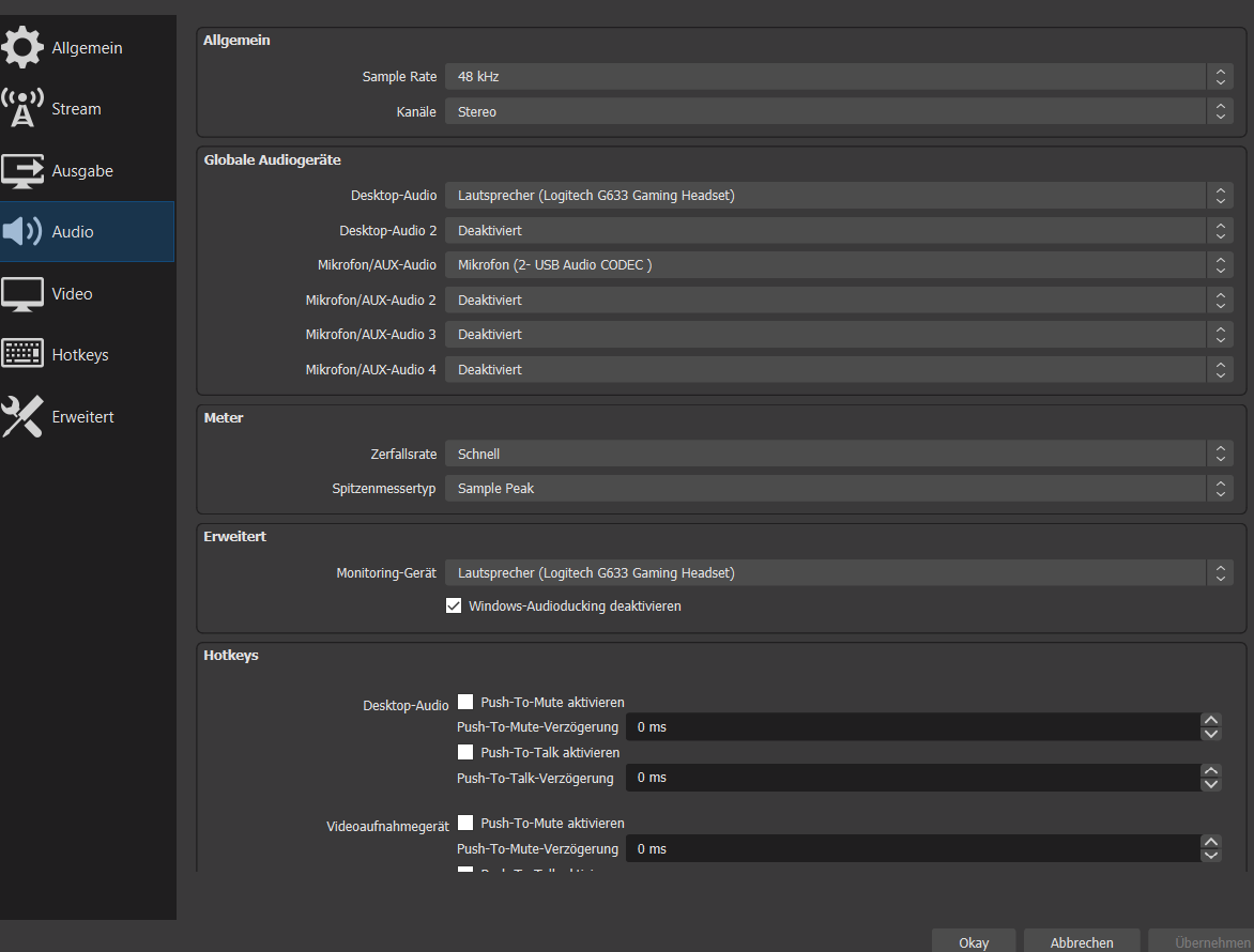 Den Übergangssound, den ich über Ownd3D bekommen habe, zeigt jetzt gar keine Regung mehr. Also ich bekomme kein Feedback auf mein Headset, aber dafür höre ich ihn in der Aufnahme bzw. im Stream.