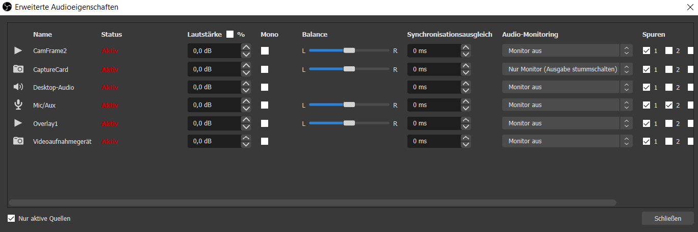 Wenn du den Sound von der Capture Carde als hauptquelle benutzen möchtes dan Musst du in den erweiterten Audioeinstellunge, bei der CapterCarde auch Minitorinung und Ausgabe einstellen. Du hast hier aber Nur Minitoring drin. Das heist der Sound geht zwar an dein Headset aber nicht an deinen Stream bzw, Aufname. Der sound von deinem Overlay hingegen geht nur in den Stream und nicht zu deinen Kopfhörern. Auch hier benödigst du die einstellung Monitoring und Ausgabe.