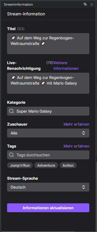 Wollte hier mal fregen ob jemand eine Software, Tool, Plugin kennt womit man den Streamtitel während des Streamings ändern kann. Beispiel. Stream gestartet und nach 10 min. merkt man der falsche titel oder game ist angegeben. Dann wäre auch noch interessant wenn man im Stream 2 verschiedene Spiele streamt und dann das auch im Titel ändern möchte.