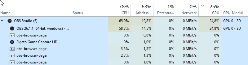 Sobald ich die HD60 ein OBS einbinde springt die Auslastung sofort auf 100% (zwischendurch mal auf 90-100)
