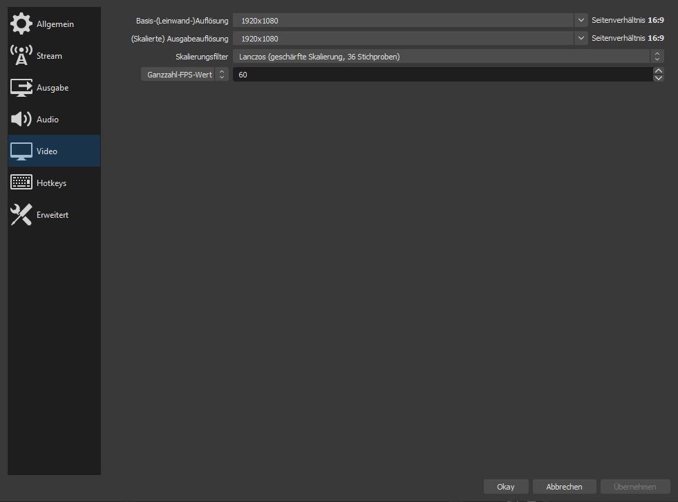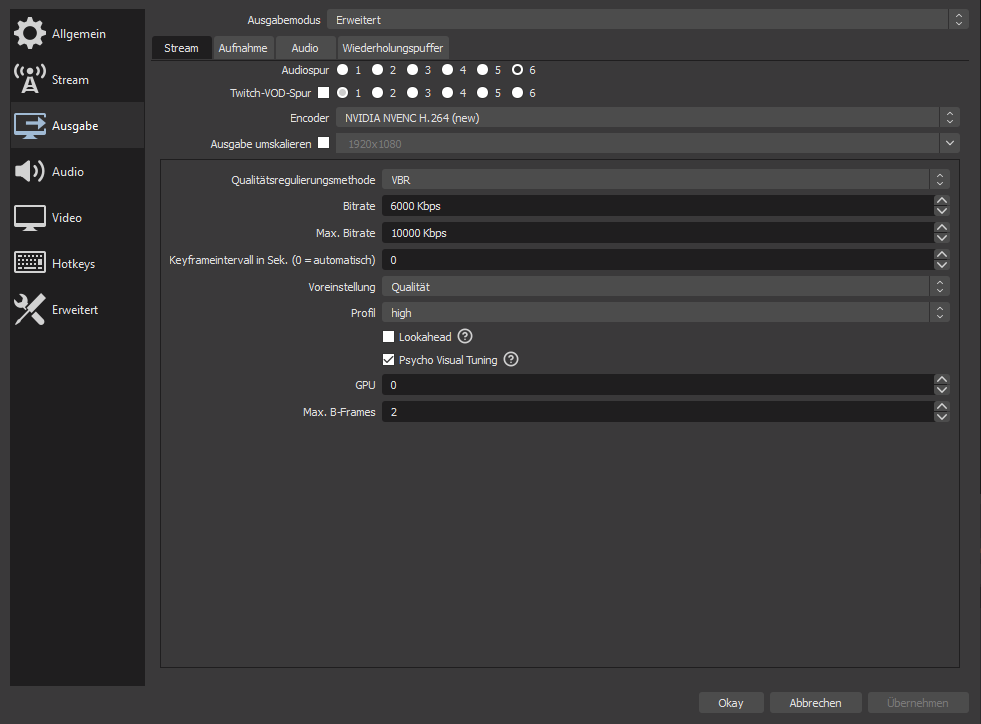 Ich streame auf 1080p mit 60 fps, habe die Bitrate auf 6.000 bis 10.000 (250k Leitung mit 30k Upload).