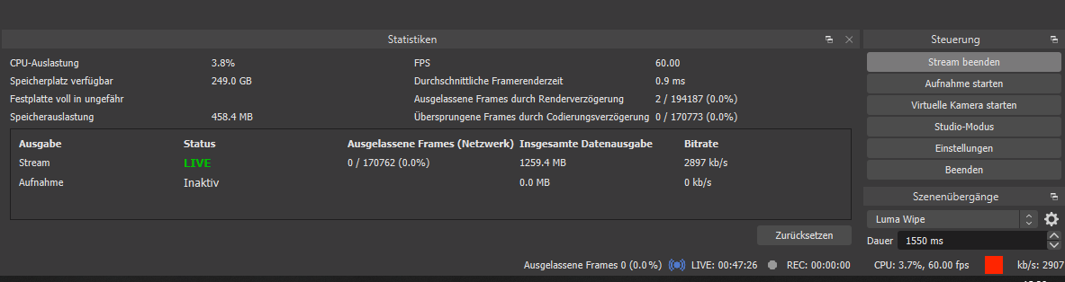 Ich habe es mit StreamlabsOBS und mit OBS getestet. Windows habe ich auch bereits neu aufgesetzt. Internetleitung 500MBit/s im Down und 50MBit/s im Up. Auch mit mehreren zeitlich unterschiedlichen Speedtests nachvollziehbar. GraKa, Mainboard etc. Treiber aktualisiert. Windows Spielemodus mal deaktiviert und aktiviert beides ohne Erfolg.