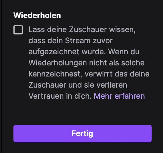 Hey und zwar habe ich das Problem das ich live auf Twitch streame aber wenn meine Freunde auf meinen Kanal gehen steht da ich würde eine Wiederholung streamen ... weiß jemand wie ich das ändere ?