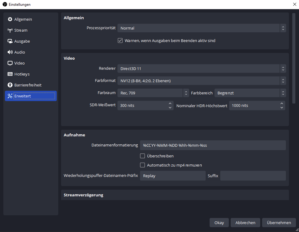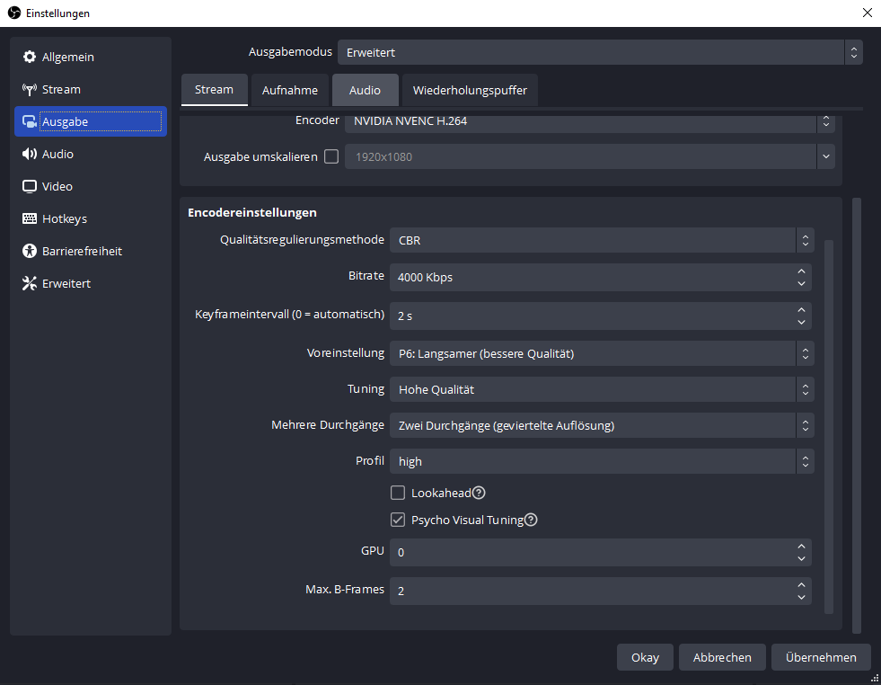 Und wie viel Bitrate sollte ich machen die Ausgabe von mir ist auf 1920x1080 was sollte man noch unter Erweiterten Einstellung ändern?