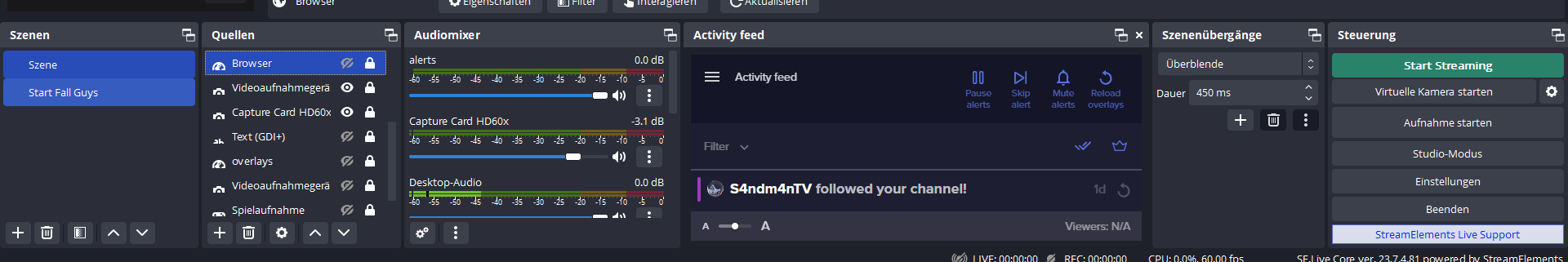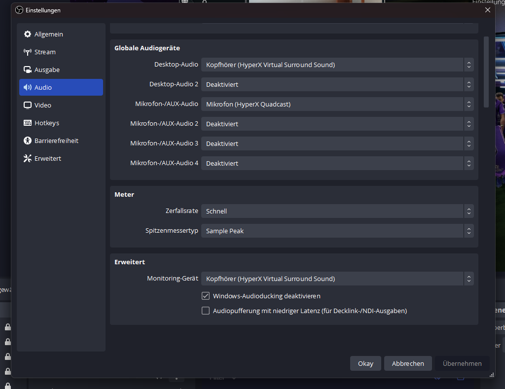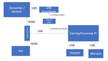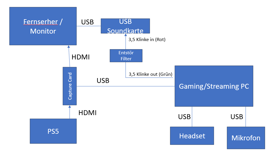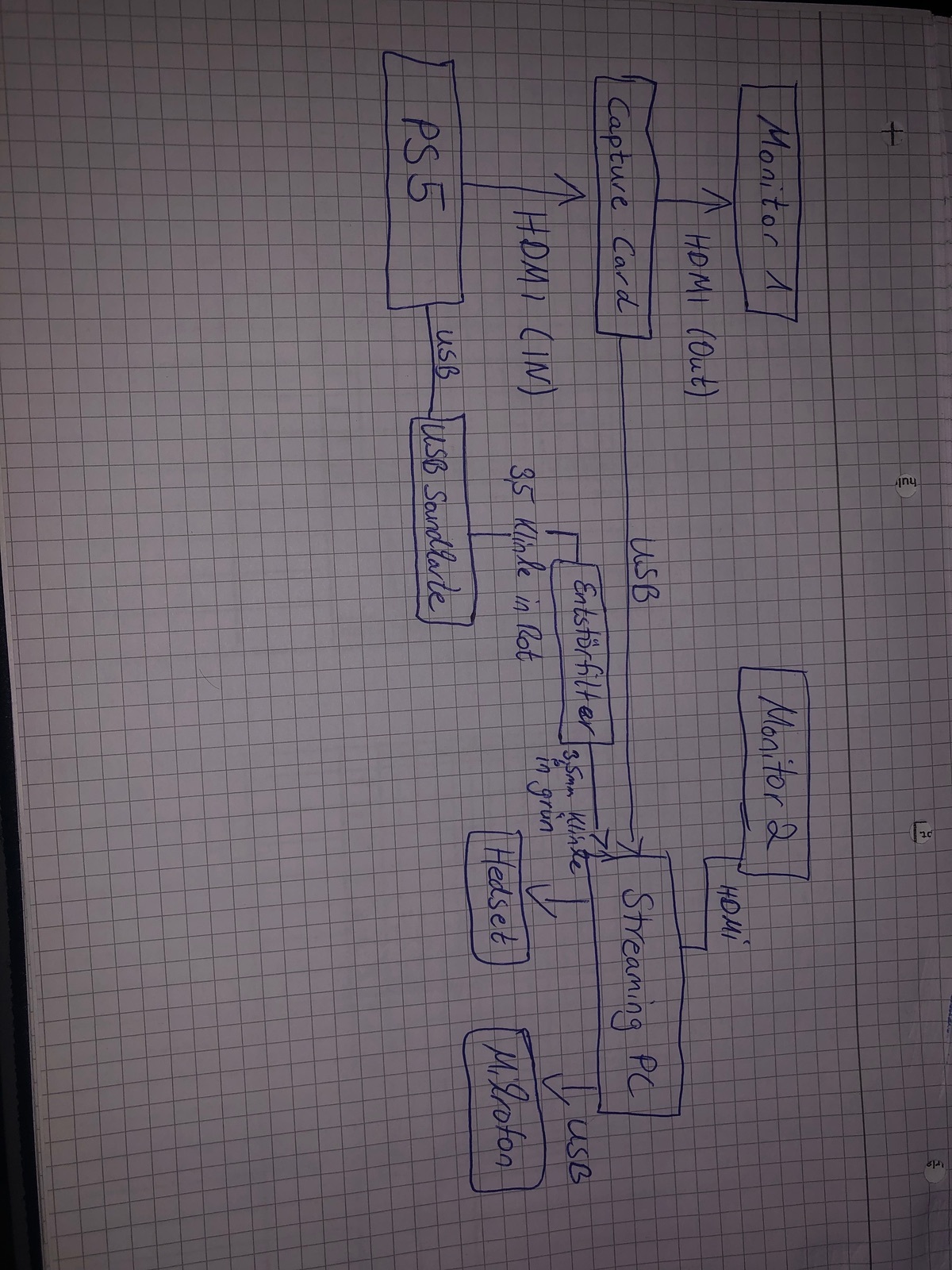 Ich besitze eine Elgato Capture Card HD60 X , ein Stand Mikrofon von HyperX Quadcast , und ein Gaming Headset von HyperX Cloud 2 , ich möchte wie gesagt über den PC Streamen , und über die PS5 zocken, die Capture Card überträgt das Bild einwandfrei auf OBS , Oberlays etc. sind alle schon erstellt , ich bekomme es einfach mit dem Ton nicht hin, ich möchte das ich über das Gaming headset den Gaming Sound höre , Discord wo ich mit meinen Freunden reden kann während dem zocken , und über das standmikrofon möchte ich das man mich hört , weil dieses ja hochwertiger klinkt als das Gaming Headset.