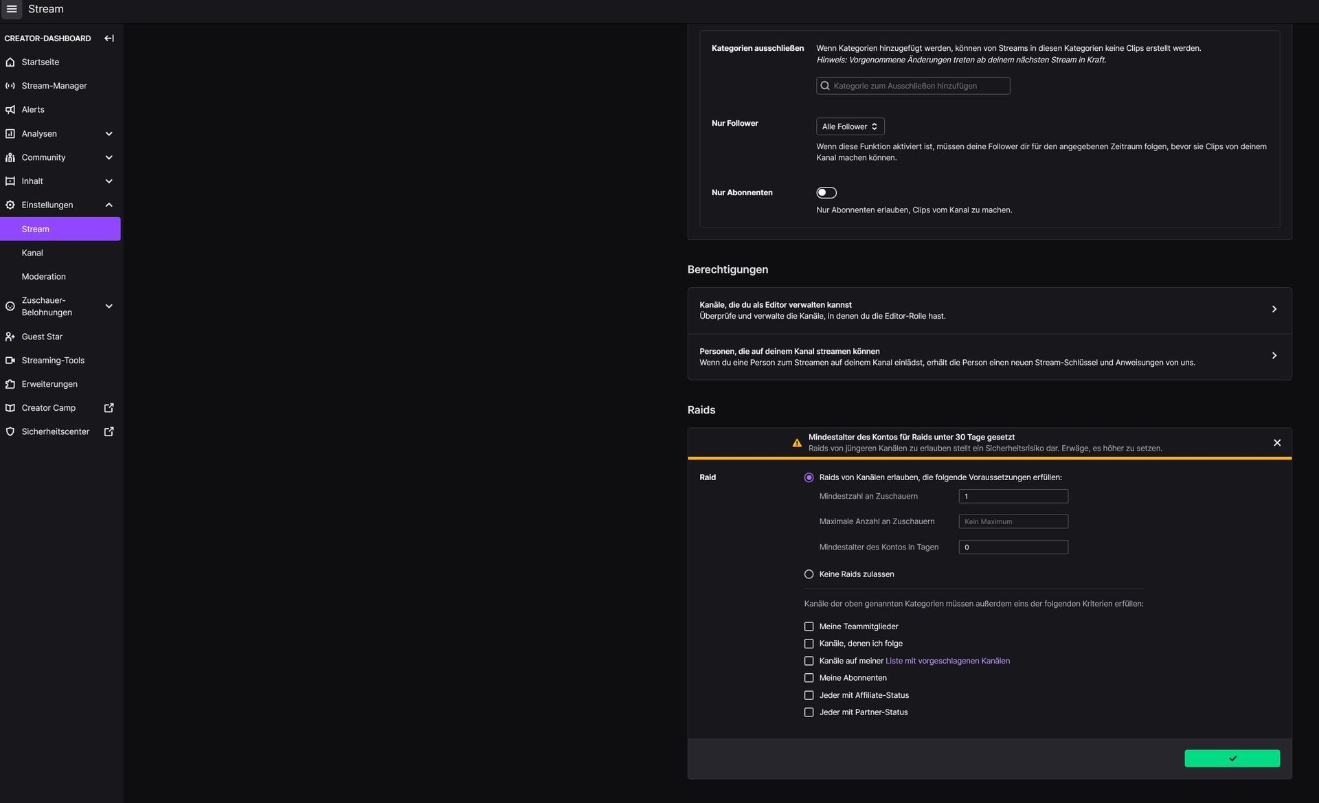 Es ist egal welchen Kanal ich raide es kommt immer diese Meldung in der auch der Kanalname steht den ich raiden möchte. Es gibt ja auch keine gescheiten einstellen bzgl. Raid in Twitch.
