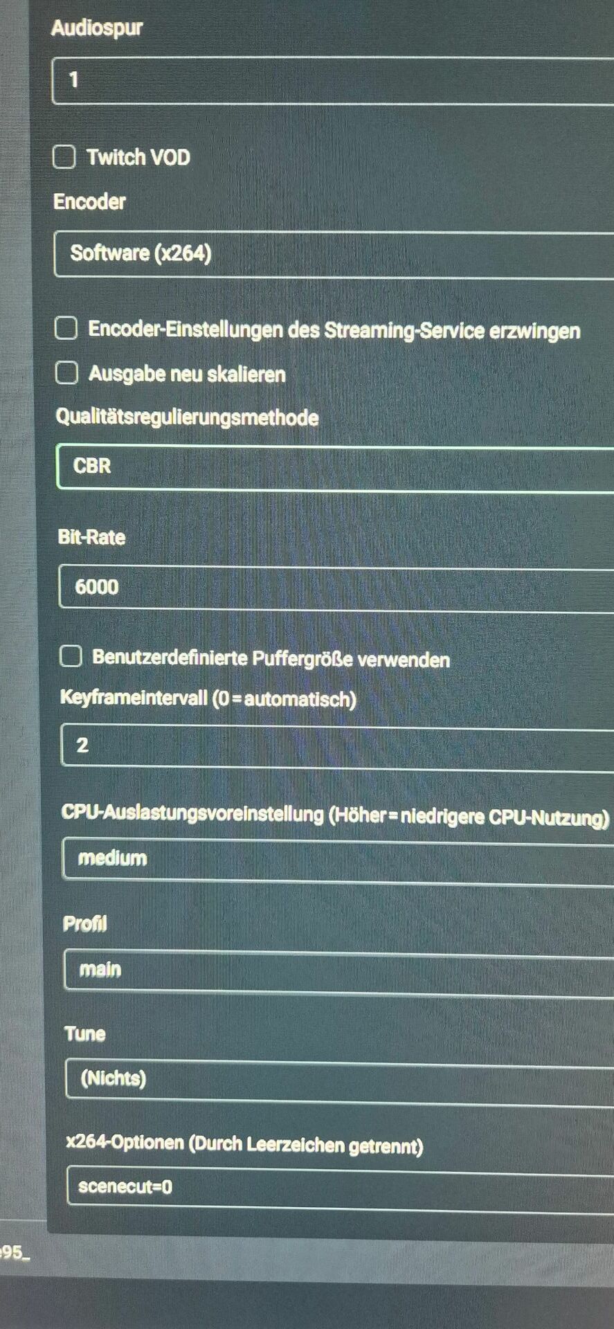 Vielen Dank erstmal für deine Unterstützung! Ich bin jetzt von Streamlabs wieder auf OBS umgestiegen, weil ich dachte, das bringt vielleicht mehr. Meine OBS-Einstellungen sind wie folgt: Ich nutze eine konstante Bitrate von 8000 Kilobit pro Sekunde bei einer Ausgabereauflösung von 1280x1080. Die Basisauflösung ist ebenfalls 1280x1080. Ich habe den Preset auf P5 (also langsam für gute Qualität) und das Tuning auf hohe Qualität gestellt, mit zwei Durchläufen, habe es aber auch schon mit einem Durchlauf ausprobiert, sowie mit den Presets P4, P6 und P7 – leider ohne den gewünschten Erfolg. Die B-Frames sind auf 2 gesetzt.