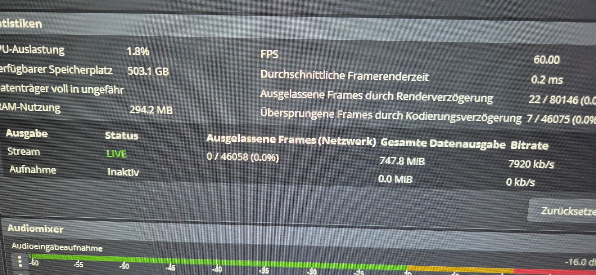 Von der Statistik sieht es ja gut aus. Nicht dass du die Ruckler siehst, weil du am PC 3 Bilder generierst. Das Spiel, die Vorschau und dann der Stream im 2. Bildschirm.