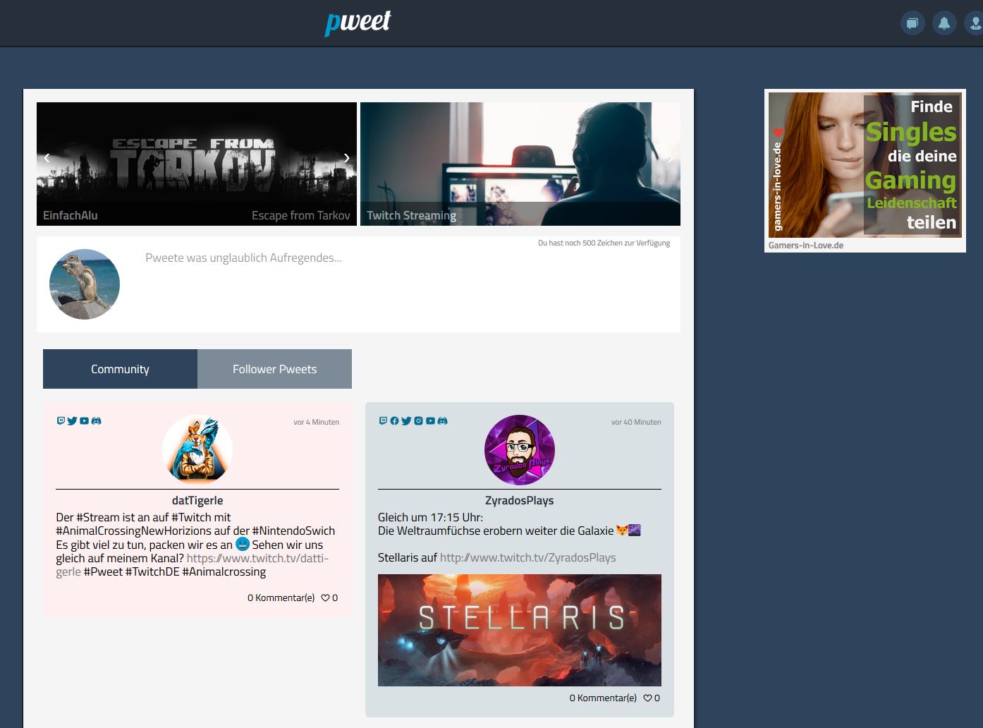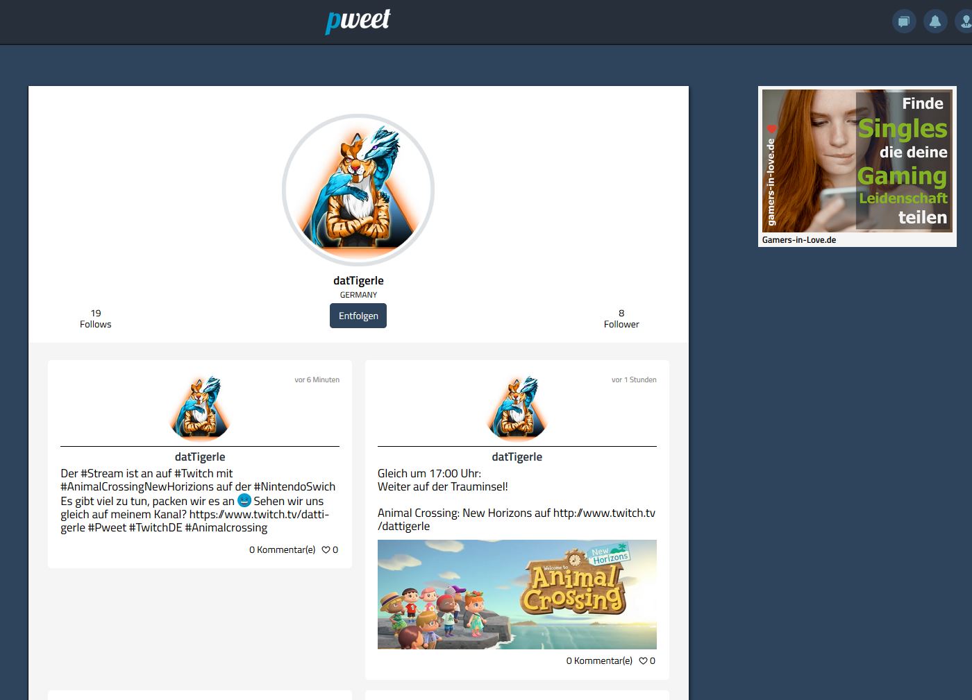 Seit Anfang März 2020 haben wir nun ein zweites Projekt online gestellt. Gamers-in-Love ist eine Singleseite, welche im Nischenbereich Gaming Menschen verbinden soll. Auf GIL findet Ihr Menschen, die Euer Lieblingshobby Gaming teilen. Aber nicht nur für Singles ist die Seite da, auch Leute in einer Beziehung können sich registrieren und durchaus neue Spielpartner oder als Streamer neue Zuschauer finden.