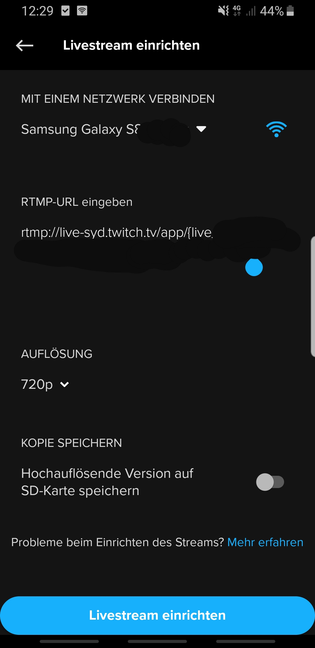 Dazu nutze ich den Hotspot meines Telefons. Und da ich wie gesagt momentan in Australien bin, nutze ich folgende RTMP Url:rtmp://live-syd.twitch.tv/app/{stream_key}