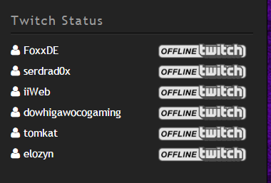 Basierend auf dem hier gemachten Vorschlag, habe ich eine Dashboardbox erstellt, auf der der Twitch Status (Stream online oder offline) von euch angezeigt wird. Angezeigt werden maximal 8* User und natürlich nur User, die das Twitch Profilfeld ausgefüllt haben. Um auch dort angezeigt zu werden, müsst ihr nur regelmäßig im Forum online sein. Es werden immer die 8* zuletzt aktiven User angezeigt. Die Box kann jeder sehen, also auch Gäste.