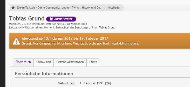 Während der Abwesenheit wird dann auch eine kleine Info in der Seitenleiste bei Beiträgen angezeigt. Zudem befindet sich in der Mitgliederliste eine Box in der Seitenleiste, die alle abwesenden User auflistet.