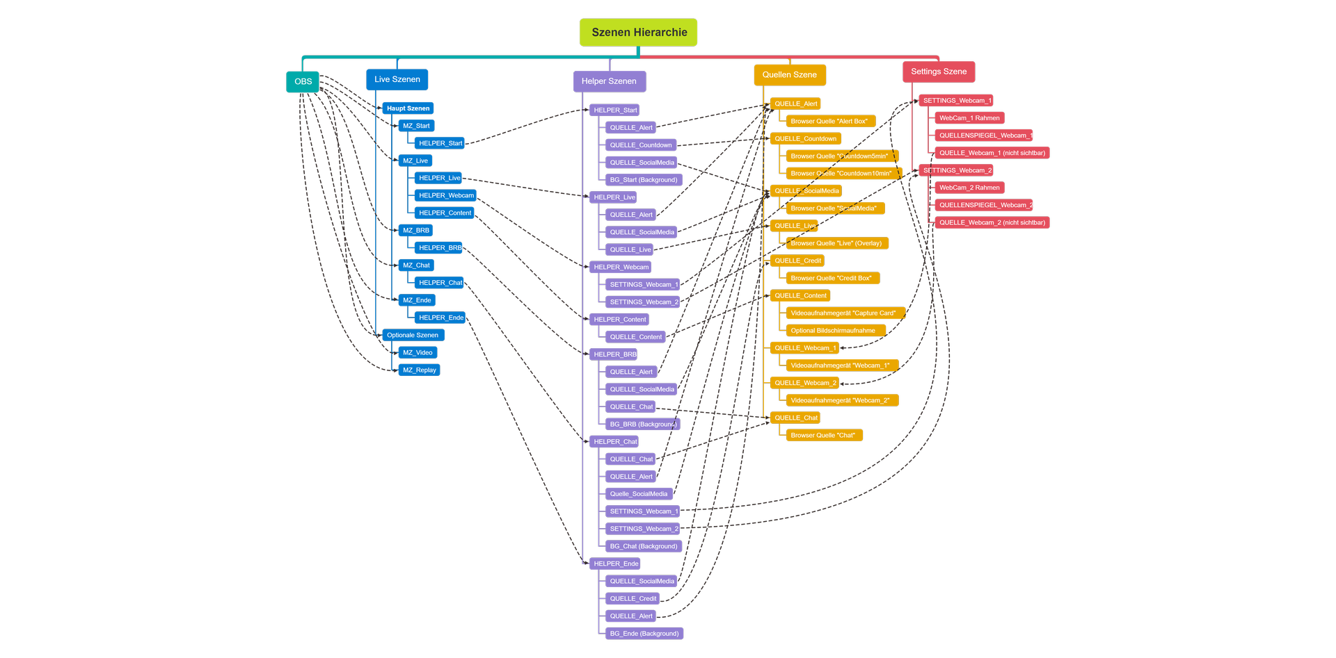 Auf dem Diagramm seht Ihr wie die Start Szene verknüpft wird. Von OBS aus wird nur die MZ_Start Szene aufgerufen.