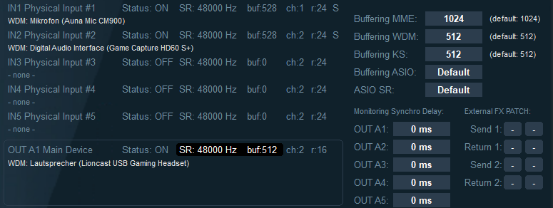 Angehängt sind auch noch die Einstellungen in Voicemeeter falls benötigt. Alle Audiogeräte sind auf 48kHZ eingestellt.