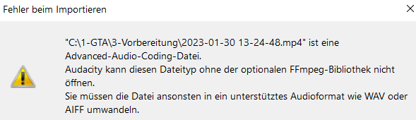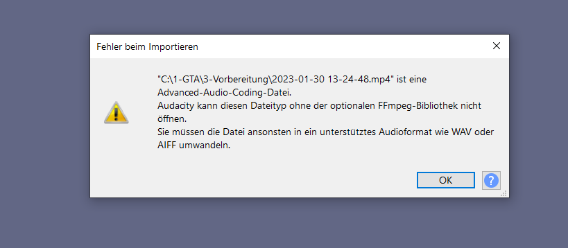 Ich habe z.B. auch Audacity installiert. Kann aber die Spuren nicht laden da spezielle ffmpeg-Datenbank fehlt. Ich habe zwar eine Installiert, aber hier die Fehlermeldung: