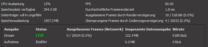 Hallo, Bin mit OBS am Streamen und habe das Problem das mein Stream öfters zuckt, oder eher zappelt. Am deutlichsten sieht man es bei Warzone in der Flugzeug-Sequence vor dem Absprung. Habe vor dem PC-Aufrüsten in 1920x1080 gestreamt und da lief alles flüssig. Jetzt habe ich einen 4K Monitor und Spiele in 2560x1440, daher muss ich den Stream ja umskalieren auf 1920x1080 und seitdem ist das Problem. Habe extra Ingame Grafik alles soweit runter gesetzt, das ich auch wenn der Streamen läuft gute 30% Prozessorlast übrig habe. Schalte ich das Spiel wieder auf FullHD läuft es super, aber sieht auf dem 4K Monitor halt kacke aus