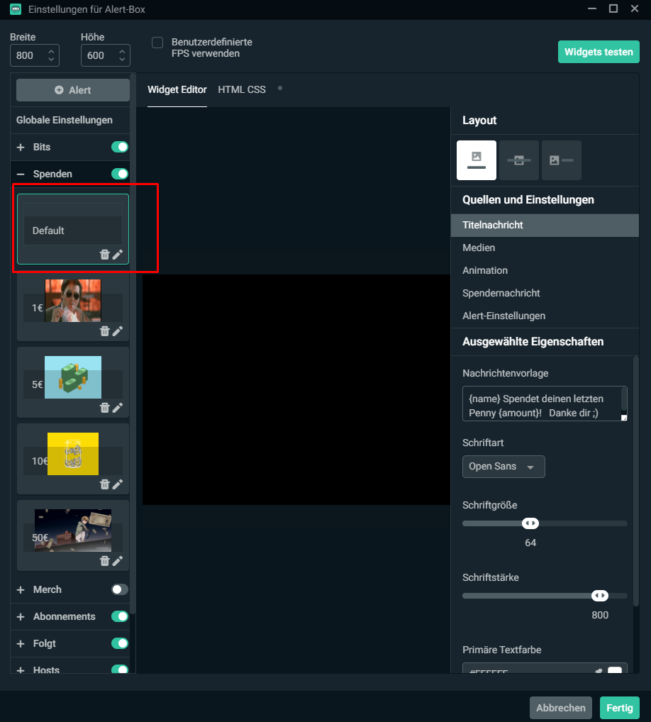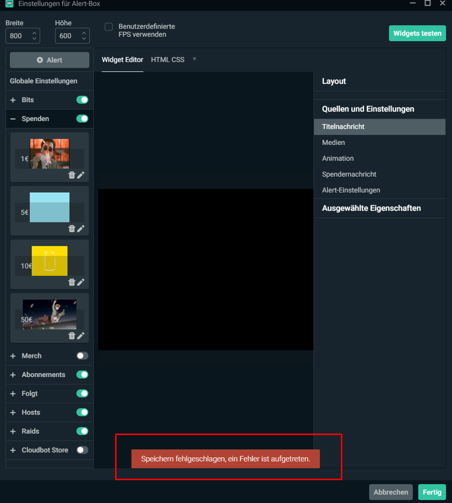 Trifft leider auf nahezu jedes Widget in SLOBS zu. Das Programm ist aktuell so verbuggt, dass ich es leider in fast keinem Fall mehr empfehlen kann. Wechsel lieber zu OBS Studio und binde die Alerts über eine Browserquelle ein. Das ist einfach viel zuverlässiger. Manchmal hilft es, sich in SLOBS und/oder im Streamlabs Dashboard auszuloggen und nochmal einzuloggen, aber selbst das ist keine Garantie.