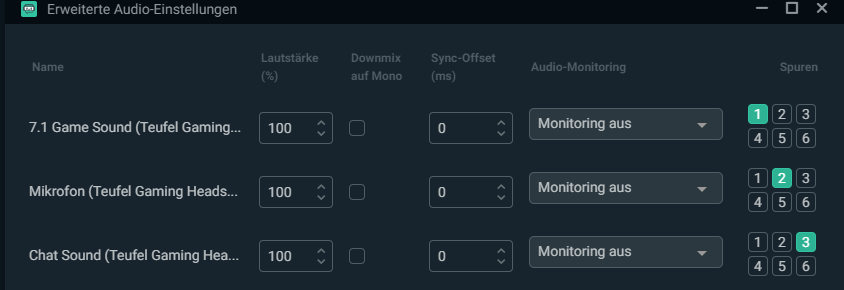 Alles anzeigenVermutlich hast du vergessen, in OBS bei den Aufnahmeeinstellungen, die anderen Spuren zu aktivieren.