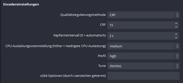 Bei Aufnahmen solltest du CQP verwenden. Irgendwas zwischen 11 und 13 würde ich empfehlen. Unter 9 solltest du nicht gehen, sonst werden die Dateien zu groß und man sieht dann eh keinen wirklichen Unterschied mehr.