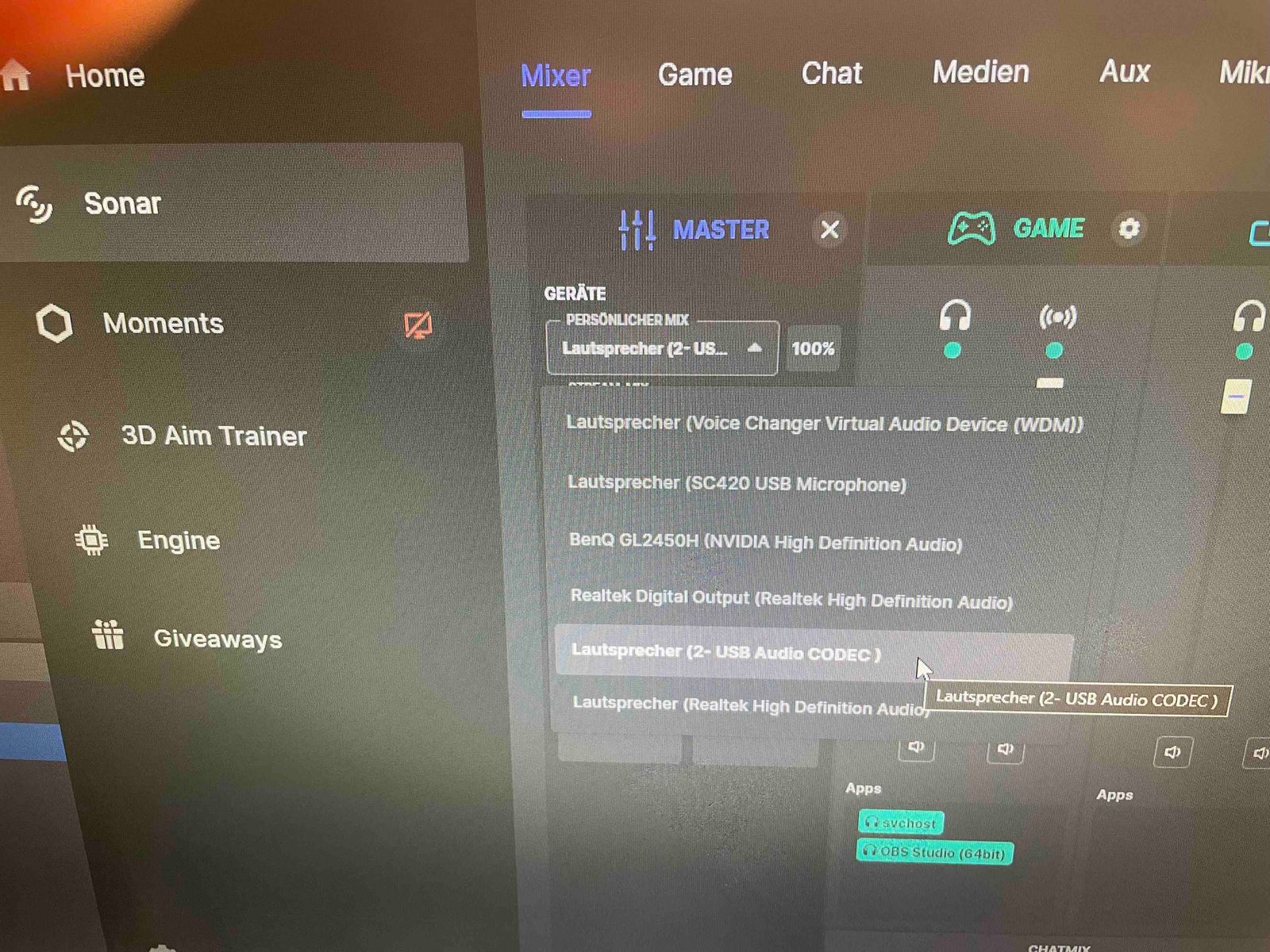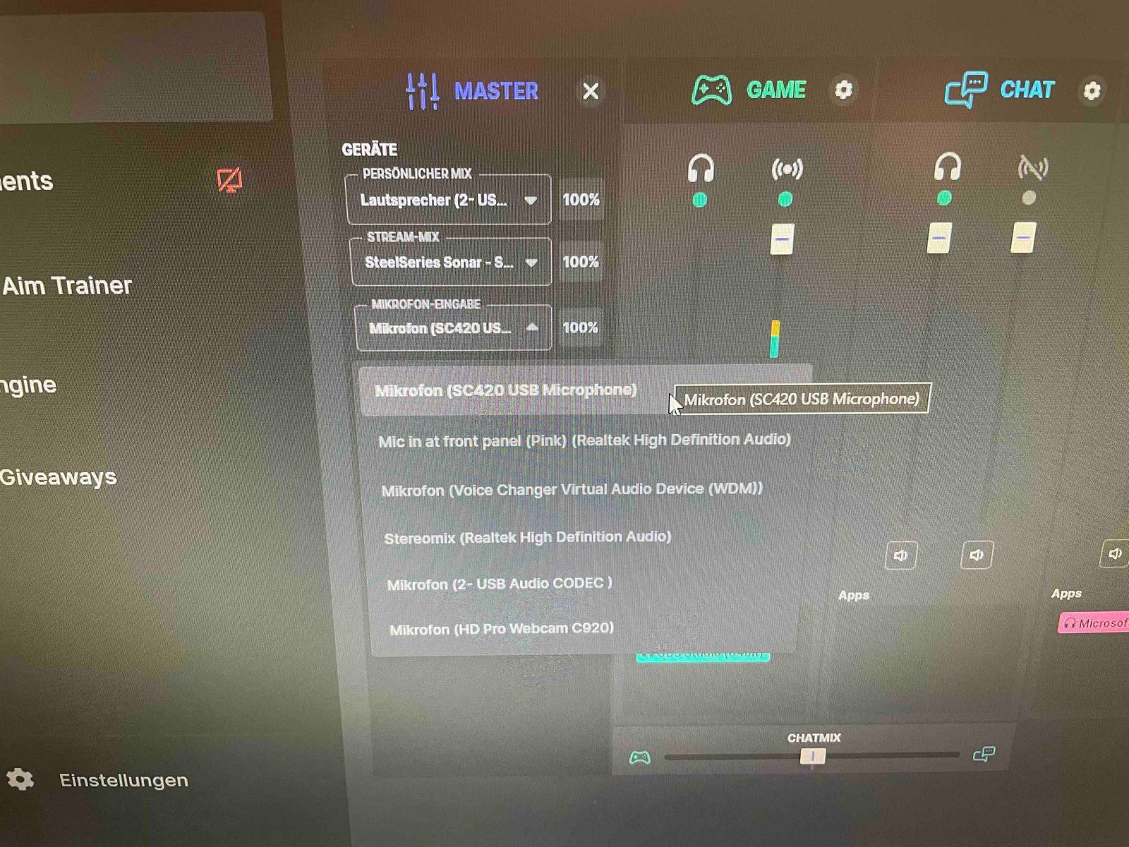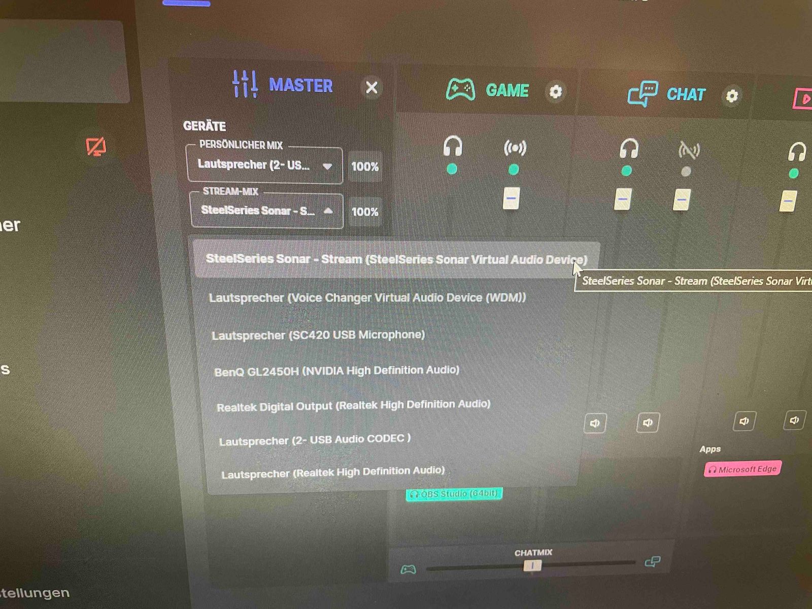 Habe mir vor ein paar Tagen das "T-Bone SC420" zugelegt welches am Streaming PC hängt.. Habe dann mit "Virtuell Cabel A,B, und schieß mich tot :D" "Voicemeeter Potatoe" (jau auch alles schön bezahlt :D) rumgespielt um später herauszufinden das "SteelSeries Sonar" einem diese ganze "Input Output virtuelle Outputs Inputs" Action abnimmt.