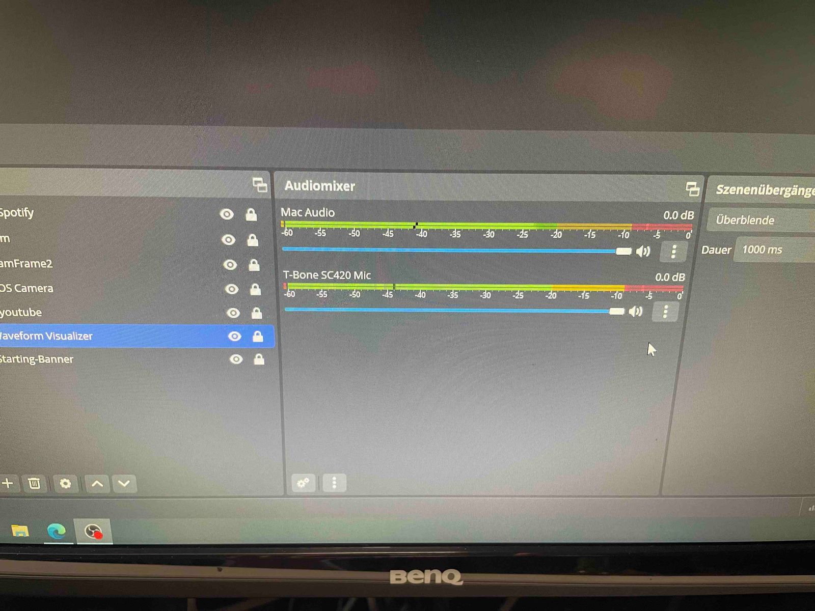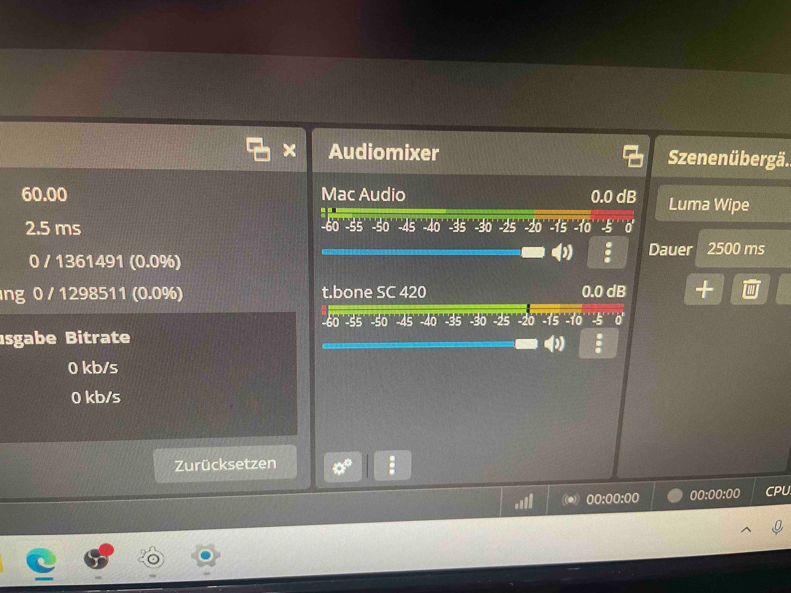 OBS läuft zumindest optisch, sprich das t.bone SC 420 Mic schlägt zwar aus aber im Stream kein Ton