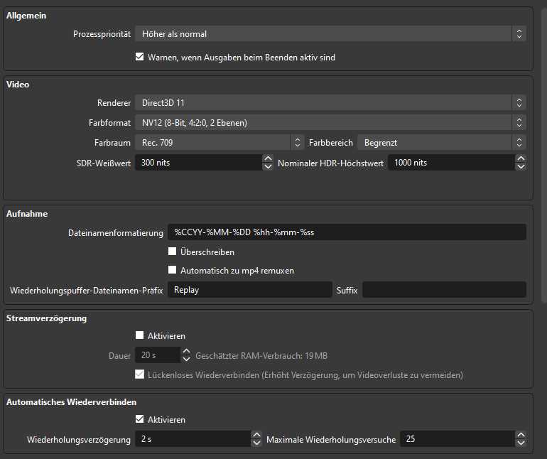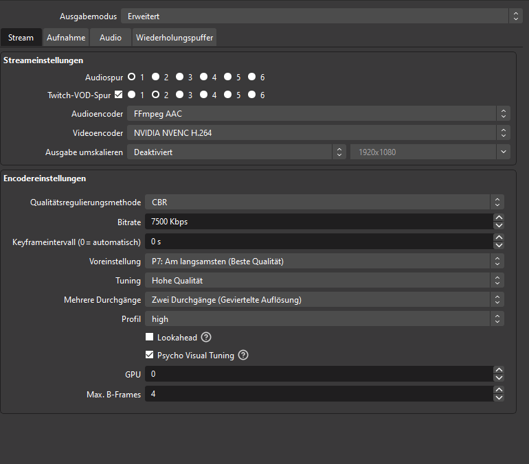 Angehängt sind meine OBS Einstellungen. Aktuell Stream ich auf 1080p (Schafft meine 50k Upload Leitung auch und das System eigentlich sowieso)