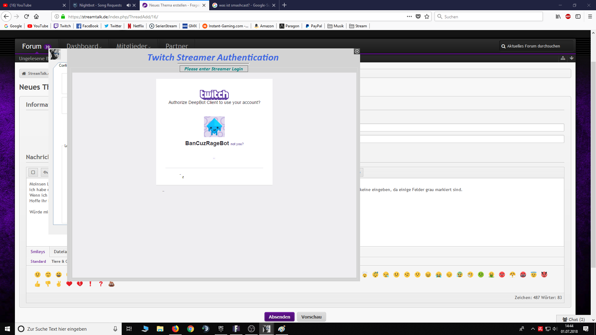 ich wollte nach langer Zeit mal wieder den Stream usw. einrichten, habe aber ein Problem mit meinem DeepBot...