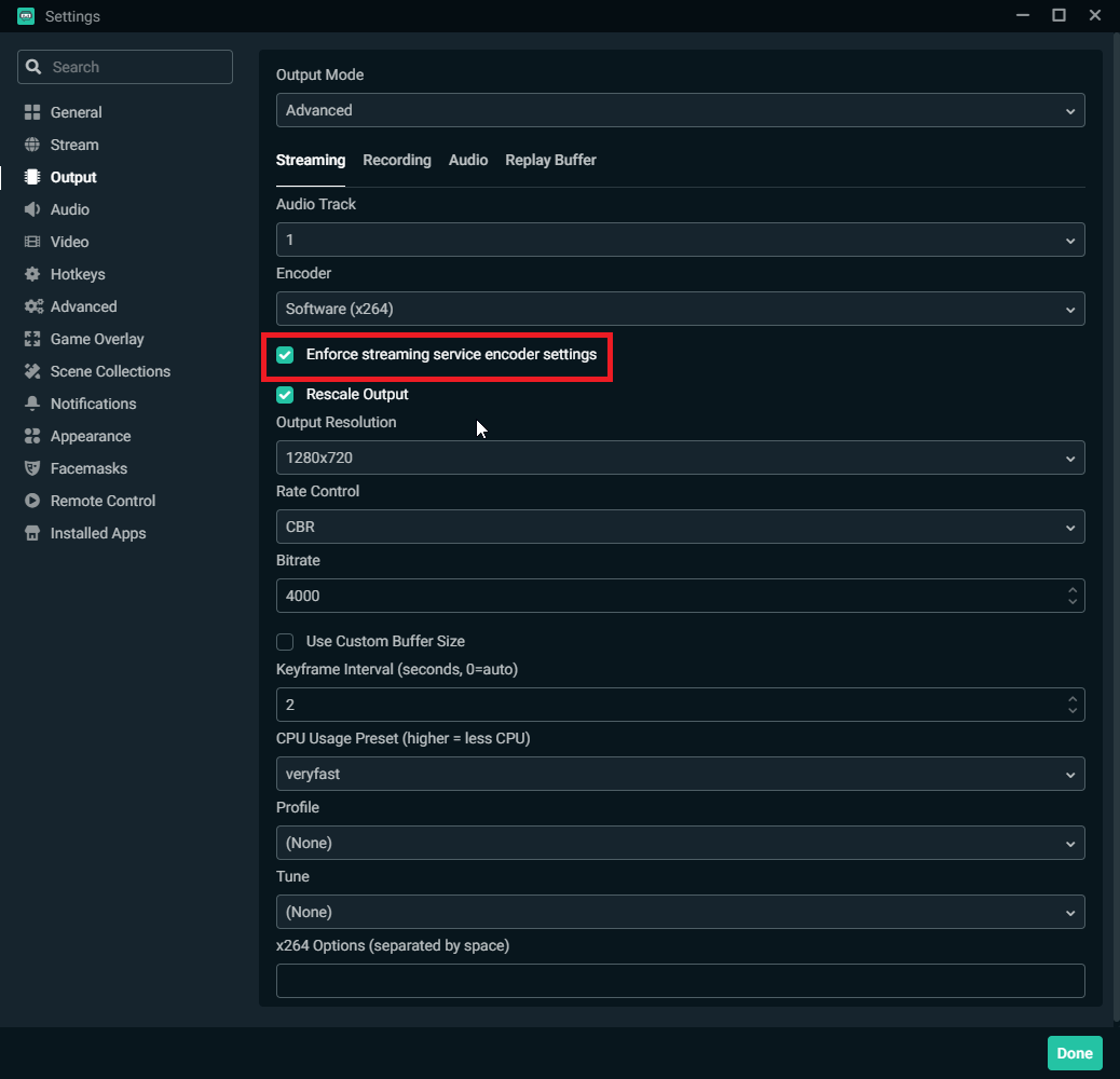 Dennoch gibt's zwei Einstellungen, die man rausnehmen sollte in den Programmen, damit man sicherstellt, dass die Qualität okay ist und die Bitrate gleich bleibt. Mit dem Haken regelt (SL)OBS sonst gern die Bitrate, wie's grad bock hat. Das will man in der Regel nicht. Also Haken bei den