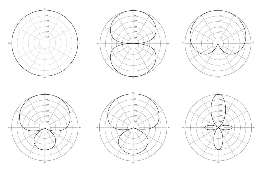 Für Podcasts ist bidirektional in jedem Fall eine gute Option. Das siehst du oben in der Mitte. Dabei wird an den Seiten wenig aufgenommen und vorne und hinten viel. Perfekt, um das Mikro in der Mitte eines Tisches zu platzieren und bei Gesprächspartnern, die sich gegenüber sitzen. Was bei Filmen in der Regel verwendet wird, sind sog. Richtmikrofone. Die sehen aus wie lange Rohre und nehmen nur in eine ganz bestimmte Richtung Ton auf. Das ist ideal, wenn man weiter weg ist und ganz gezielt eine Richtung abdecken will. Super für YouTube-Tutorials oder wenn man nicht möchte, dass das Mikrofon im Bild ist. Bei zwei Personen, die weiter weg sind, sollte man aber auch zwei Mikrofone haben in dem Fall.